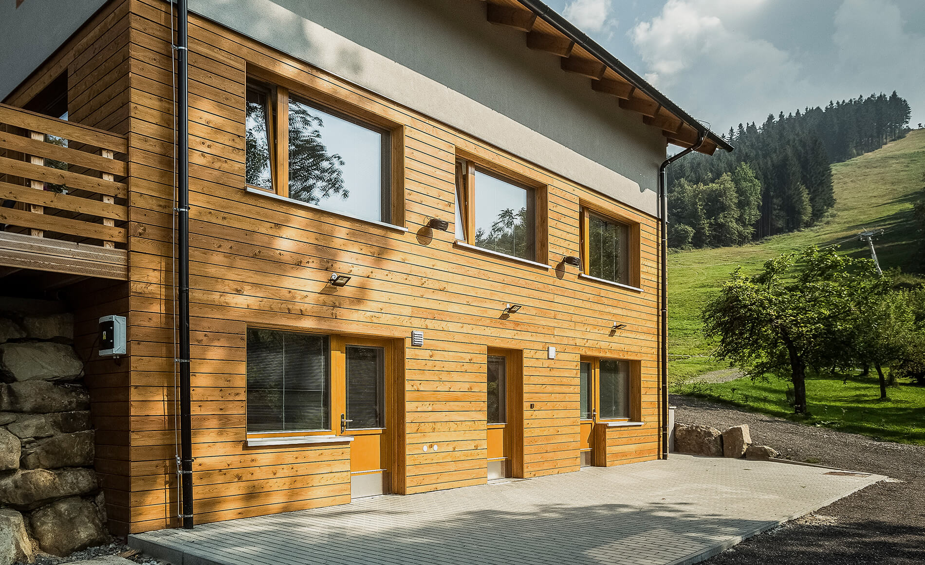 Le finestre in legno seducono grazie alle linee sinuose e naturali.